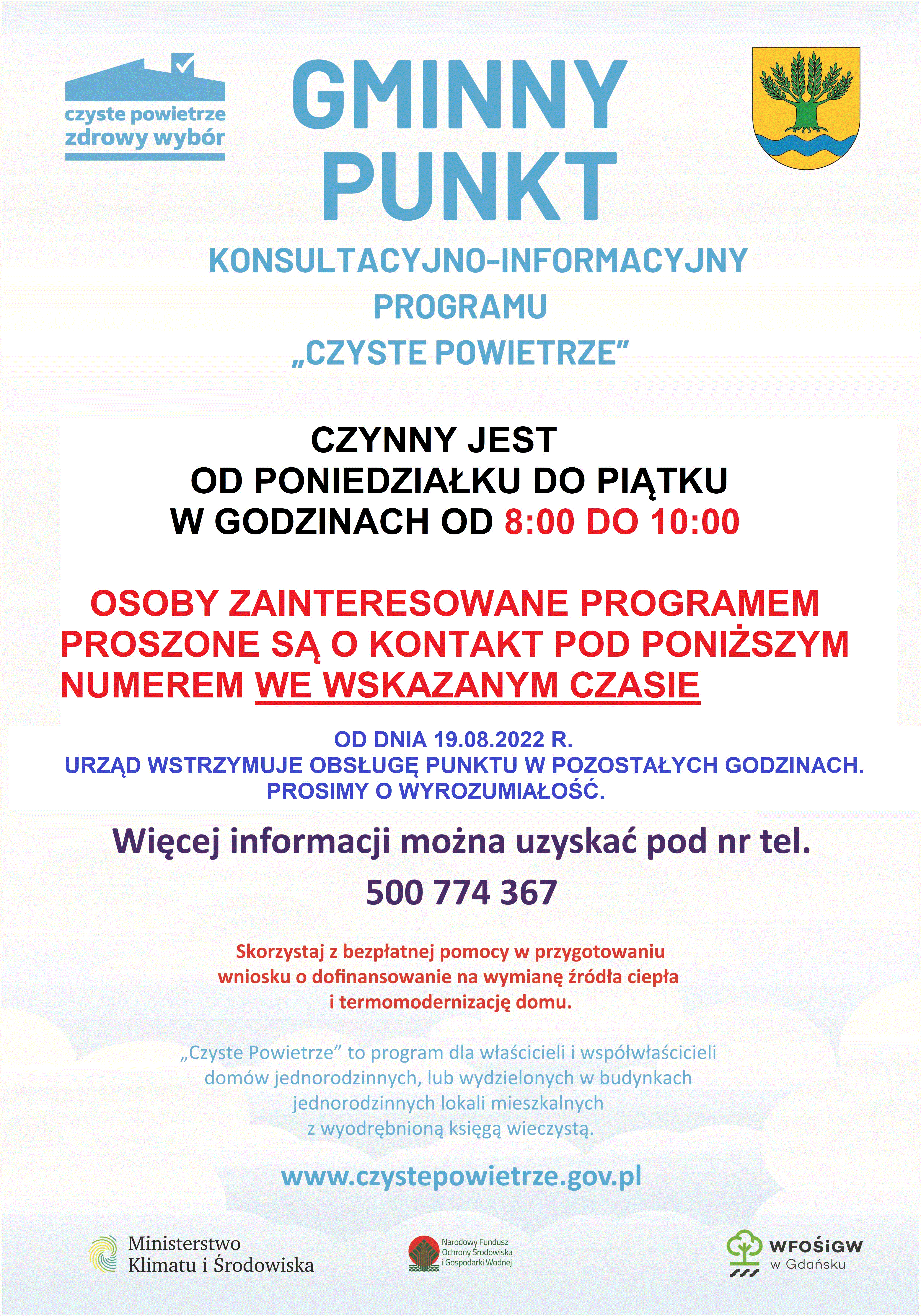 Godziny otwarcia punktu konsultacyjno-informacyjnego programu "Czyste powietrze"